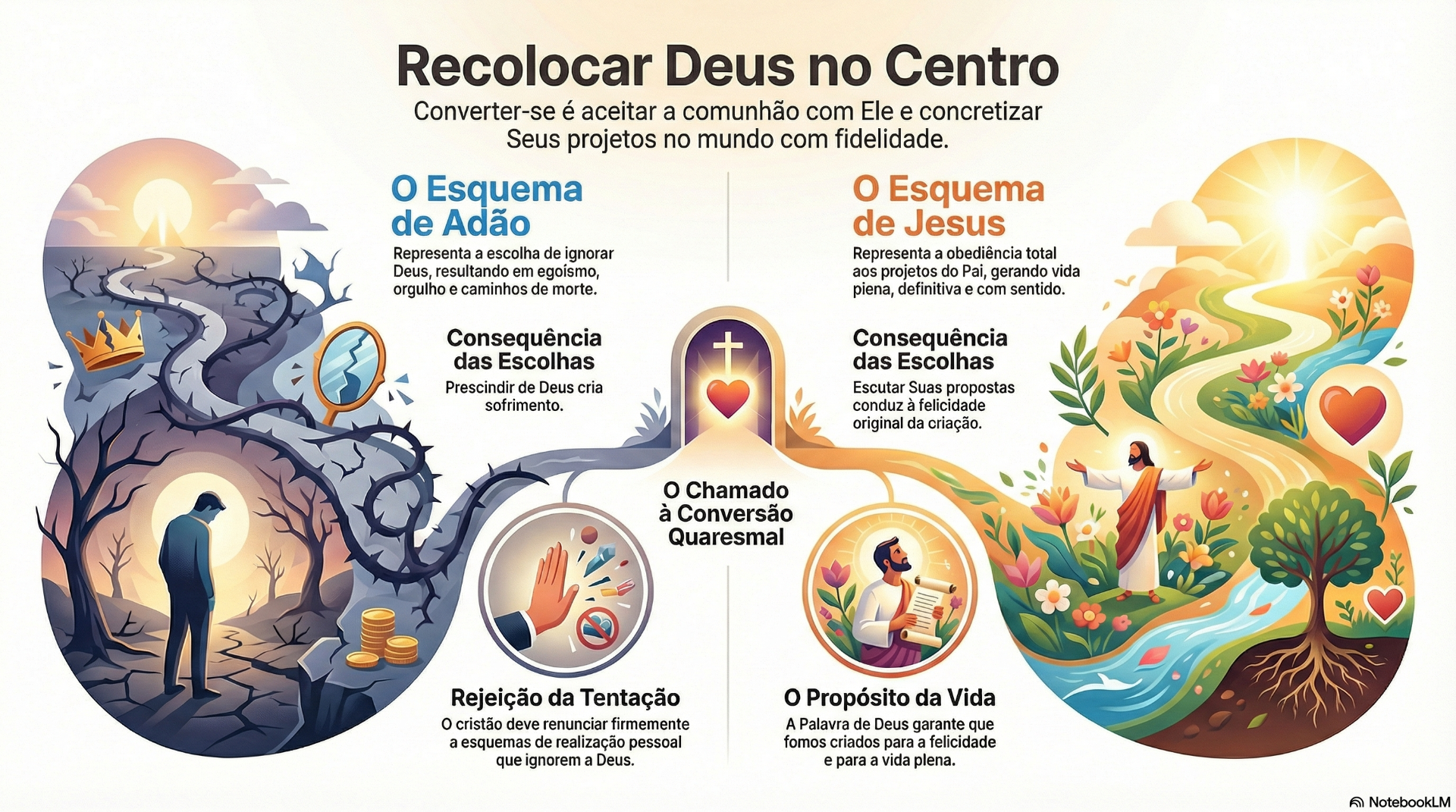 O Evangelho apresenta, de forma mais clara, o exemplo de Jesus. Ele recusou – de forma absoluta – uma vida vivida à margem de Deus e dos seus projetos. A Palavra de Deus garante que, na perspectiva cristã, uma vida que ignora os projetos do Pai e aposta em esquemas de realização pessoal é uma vida perdida e sem sentido; e que toda a tentação de ignorar Deus e as suas propostas é uma tentação diabólica e que o cristão deve, firmemente, rejeitar. (in dehonianos.pt)